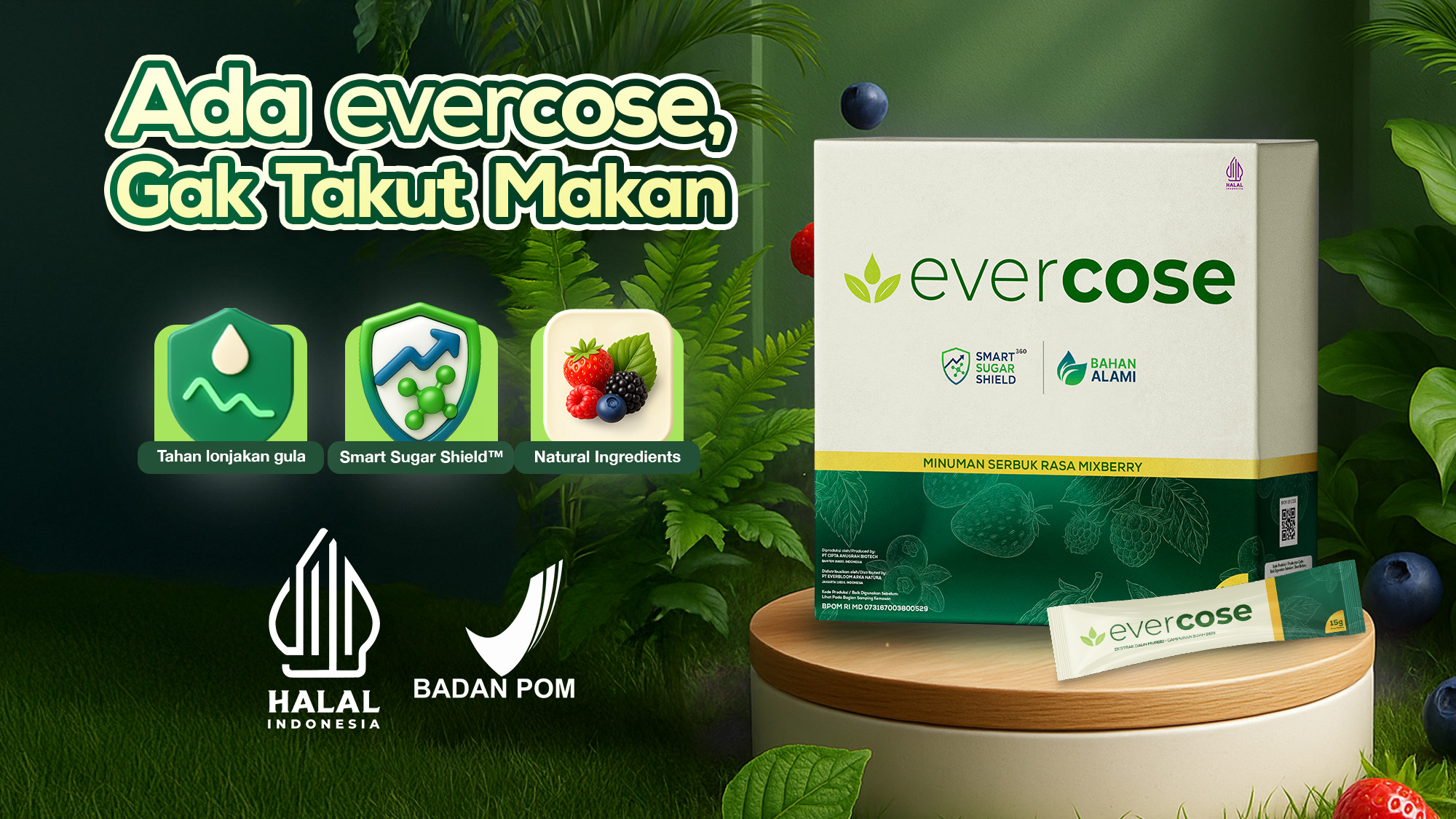 evercose dibuat dengan 100% bahan alami tanpa efek samping berbahaya. evercose juga telah memperoleh izin BPOM dan sertifikasi Halal, sehingga dapat dipastikan evercose aman dikonsumsi jangka panjang.